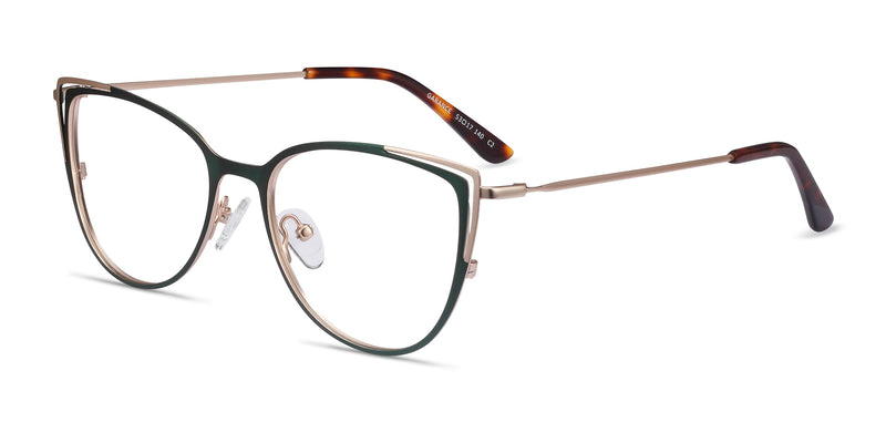 Not your typical cateye, gorgeous Garance takes an old favorite and gives it a fresh, new face. Sleek metal in two tones serves up accentuated corners alongside classic kittenish curves. The gold and hunter green combo is subtle and sleek, working overtime to make sure you're the cat's meow.
