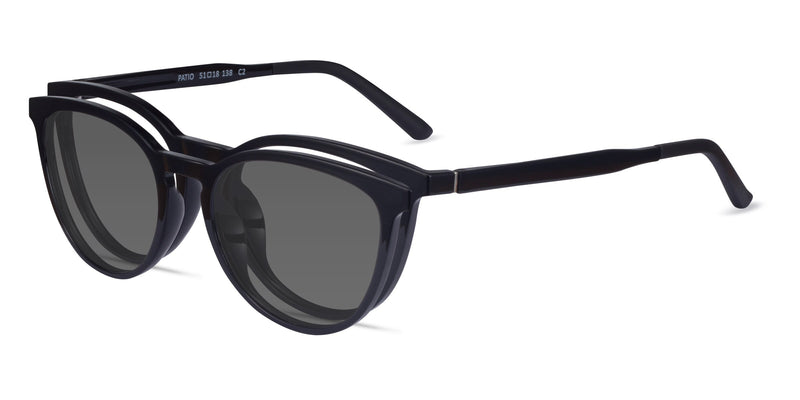 Keep your style consistent with this convenient set of specs. Patio features two looks in one — eyeglasses as the main style, with clip-on shades to add on sunny days. This frame is complete with a classic horn shape, sturdy plastic construction, and sleek black finish.