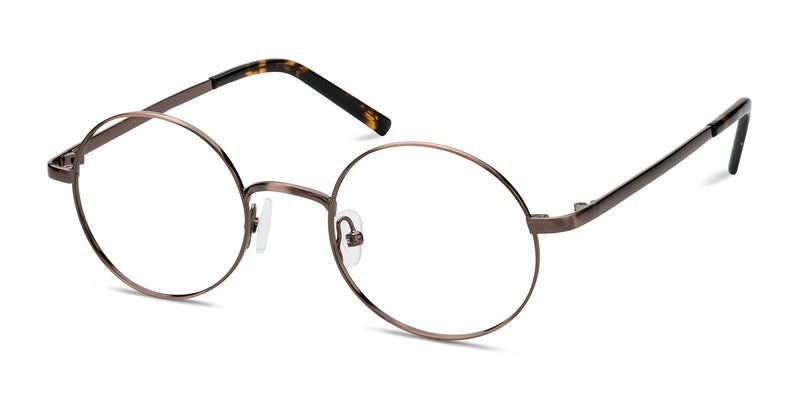 These brown eyeglasses are classically vintage and sleek. This full metal frame comes in a polished bronze finish throughout and perfectly round lenses. The temples are understated and unadorned, ending in semi-transparent plastic arm tips. It's a classic look for both men and women.