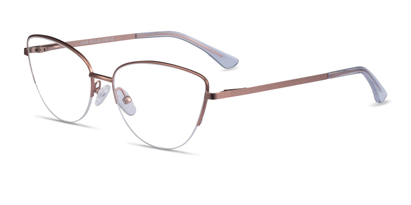 In Rose Gold, Star is a cat-eye frame like no other. This unique half-rimmed style draws attention to the wearer's browline, while keeping a subtle profile with its rimless lower half.