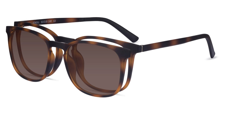 Convenience has never looked so stylish. Introducing Stroll, a multi-functional frame with a clip-on face front. Designed with magnetic end pieces, this classic rectangular style lets you effortlessly switch from eyeglasses to sunglasses for the perfect look, no matter the weather. Made from plastic, with a timeless tortoise finish.