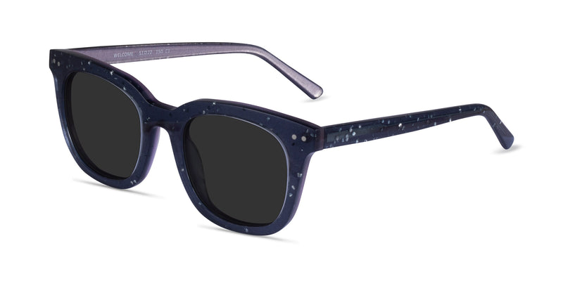 Whether you're on the road or just enjoying the sun, Welcome is here to up your shades game — featuring dark gray acetate filled with silver flecks of foil and glitter. A set of confident square lenses further set this frame apart, complete with double stud rivets for a classic look.