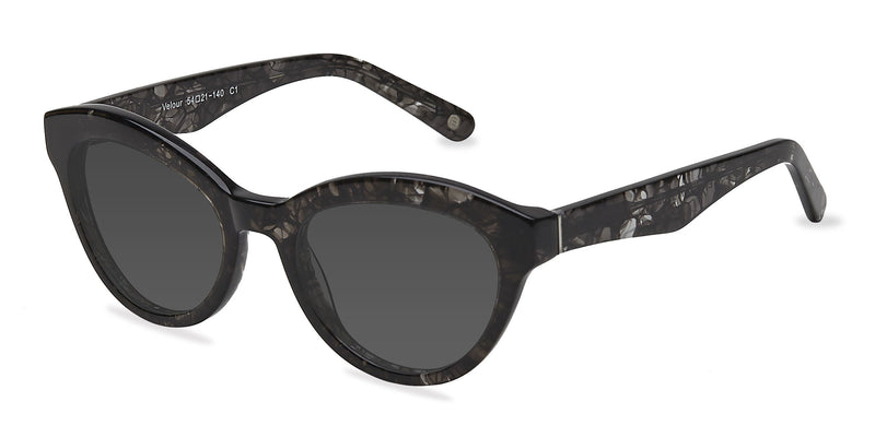 Get noticed this summer with these edgy Velour sunglasses. The mosaic gray acetate finish, broad temples, and cat-eye shape give a bold, eye-catching look.