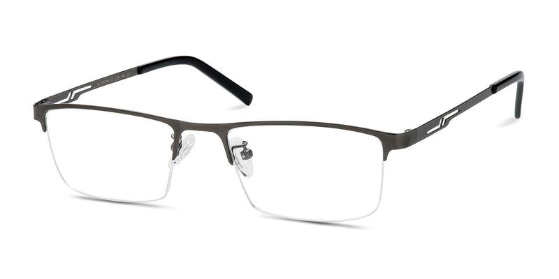 The sharp, angular design of these eyeglasses looks simultaneously edgy and sophisticated. This semi-rimless frame has a Gunmetal finish that really accentuates the browline. The bold temple detailing adds a little something extra to this frame making them perfect for any occasion.